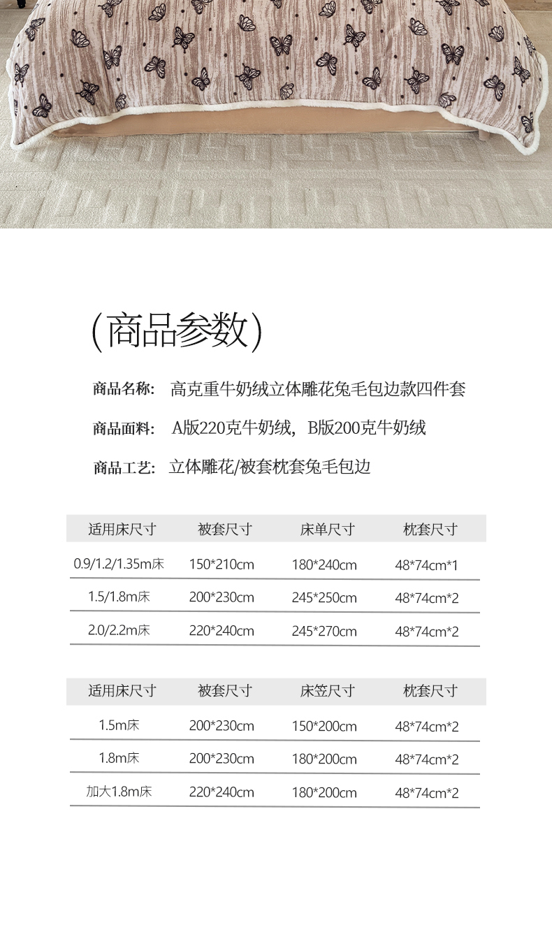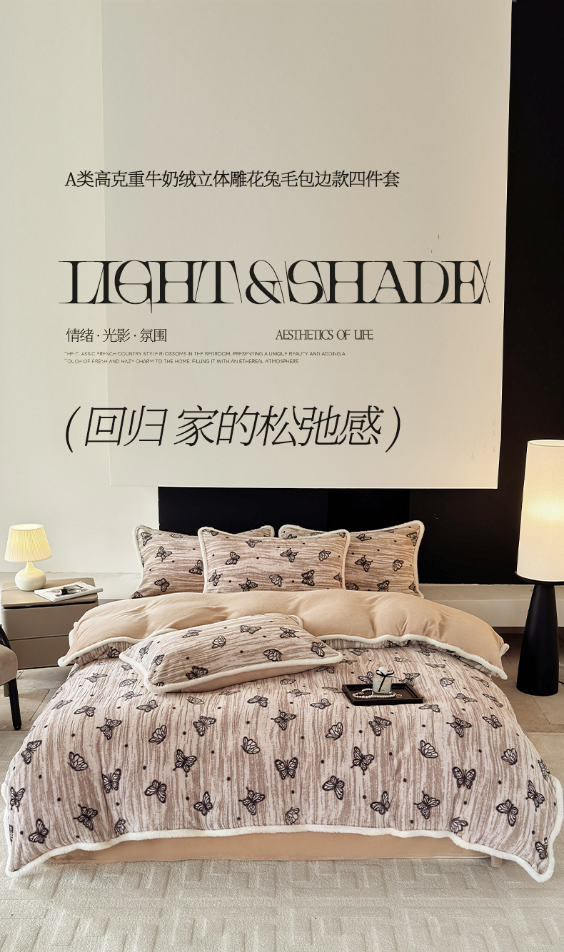2025新款高克重牛奶绒雕花兔毛包边款系列四件套