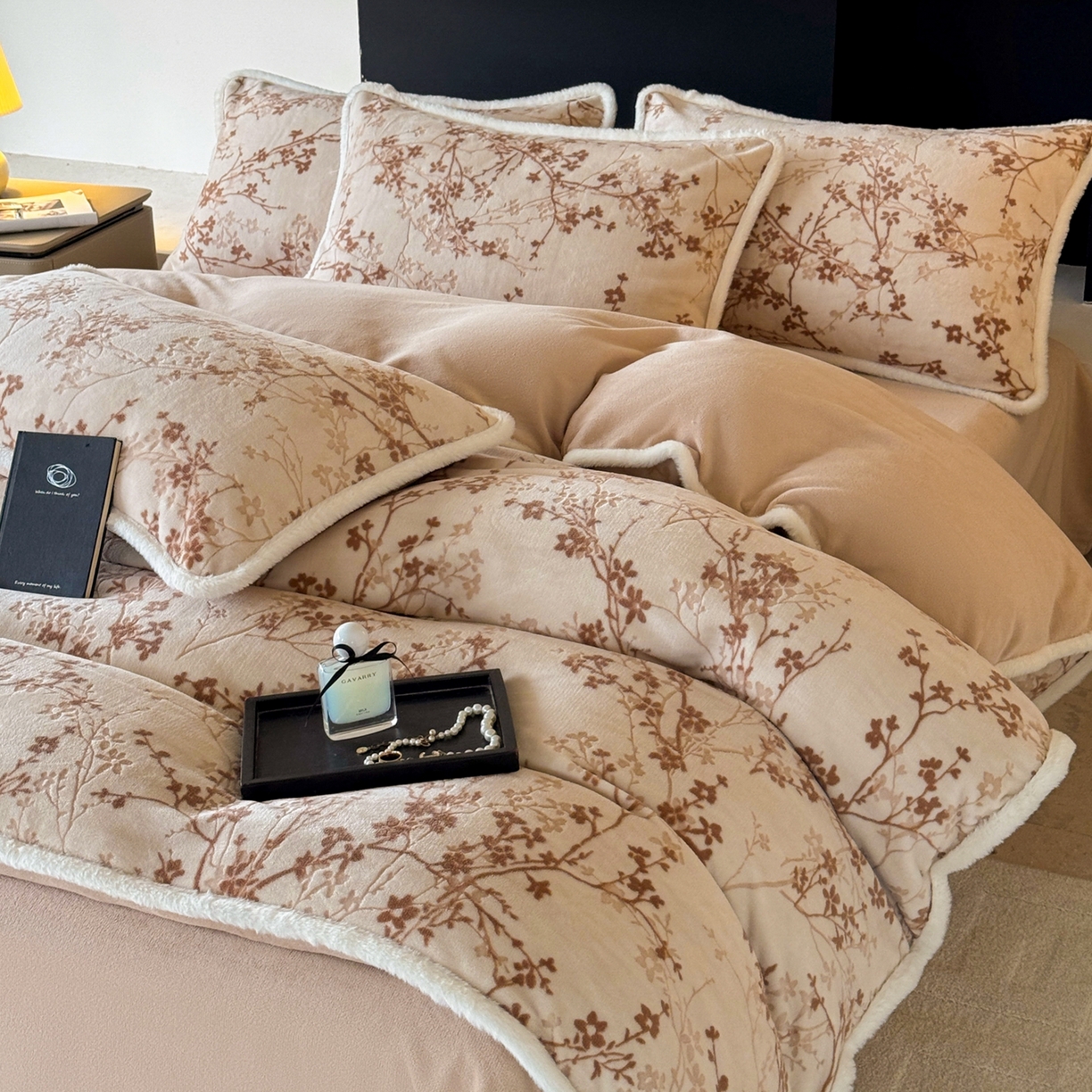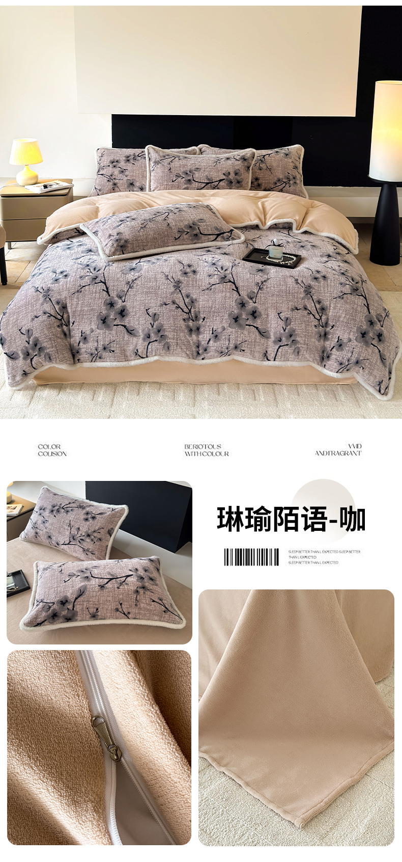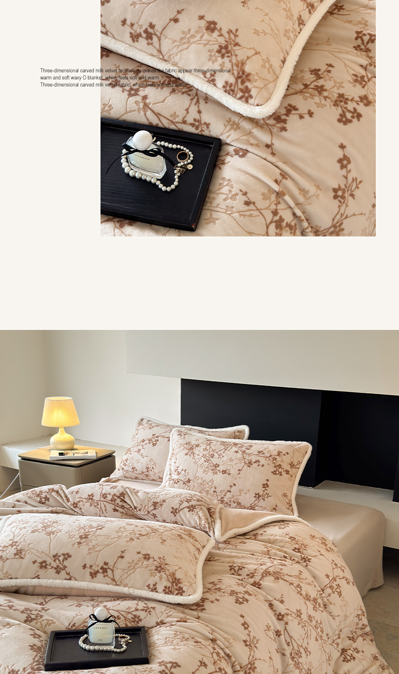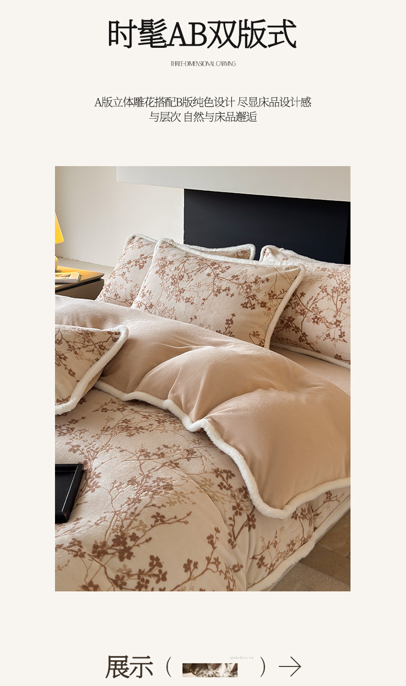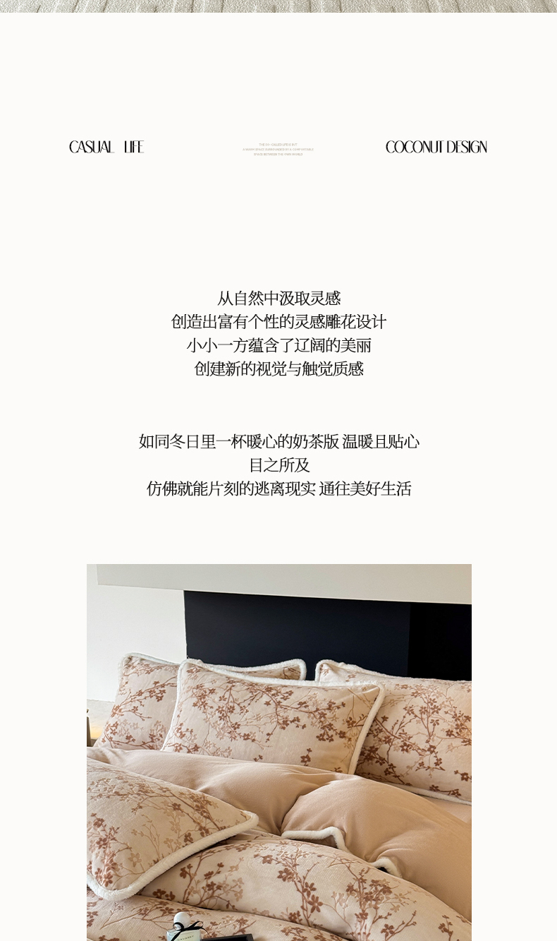 莱登卡奴 2025新款高克重牛奶绒雕花兔毛包边款系列四件套 山茶花语-咖