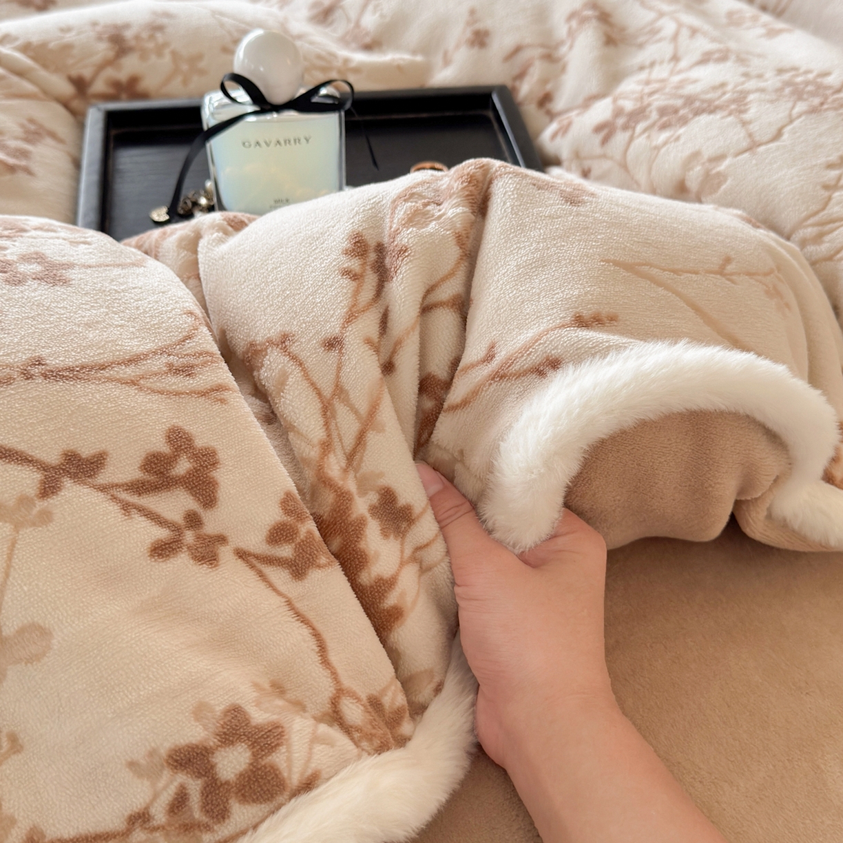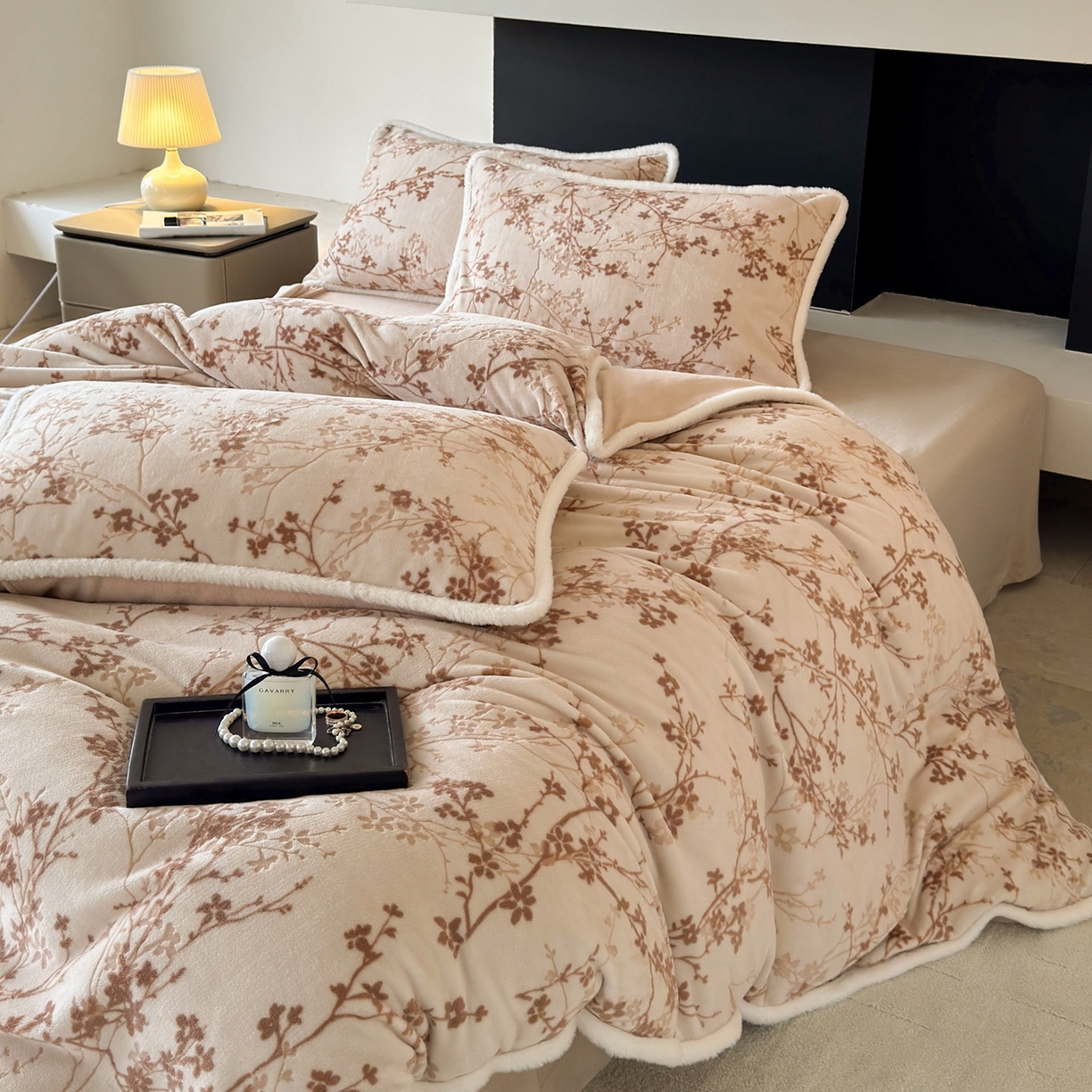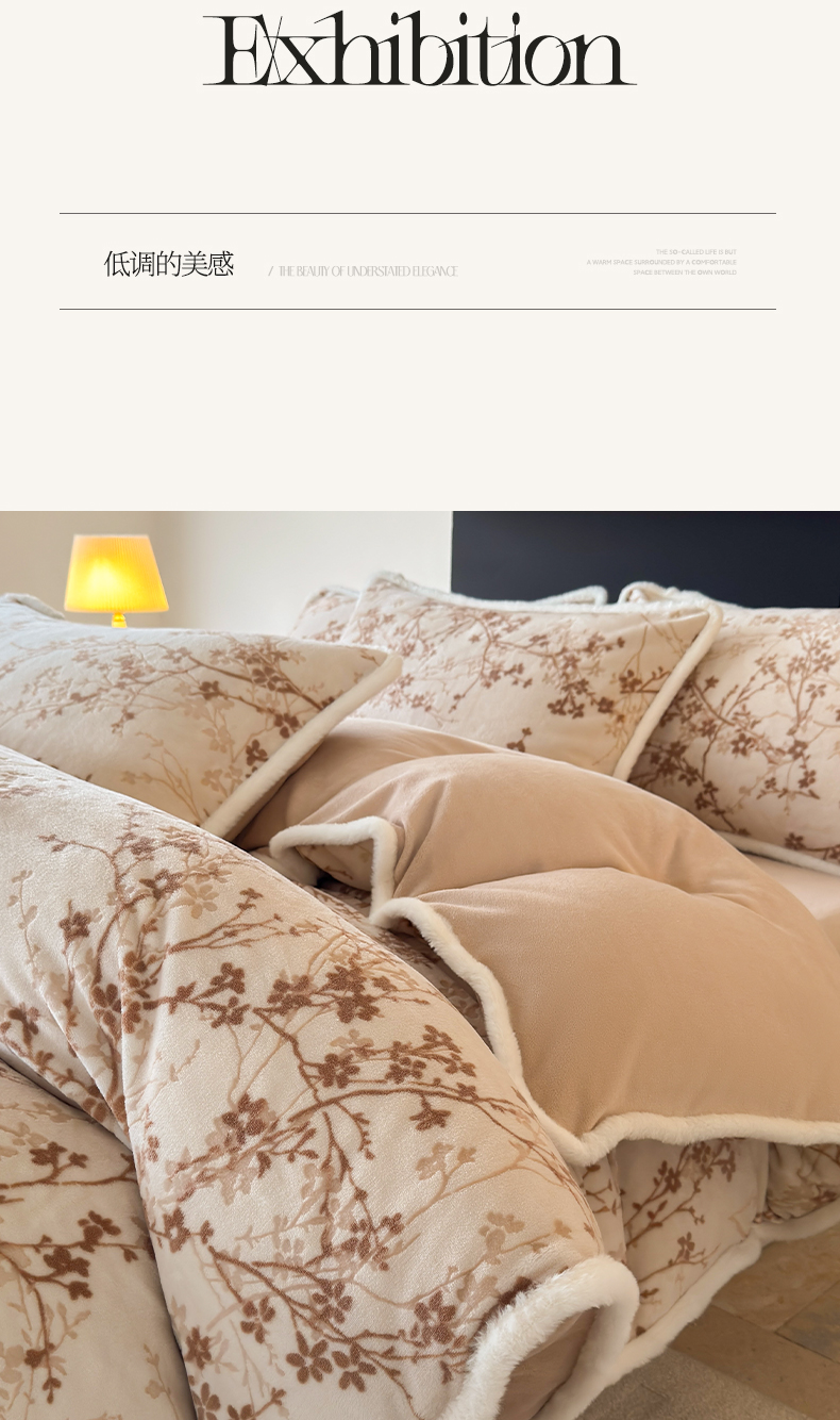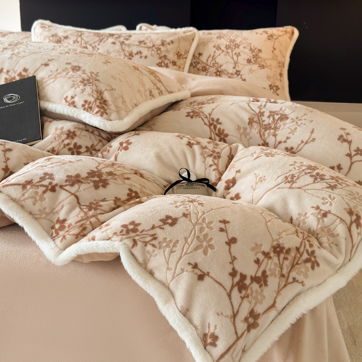 莱登卡奴 2025新款高克重牛奶绒雕花兔毛包边款系列四件套 山茶花语-咖