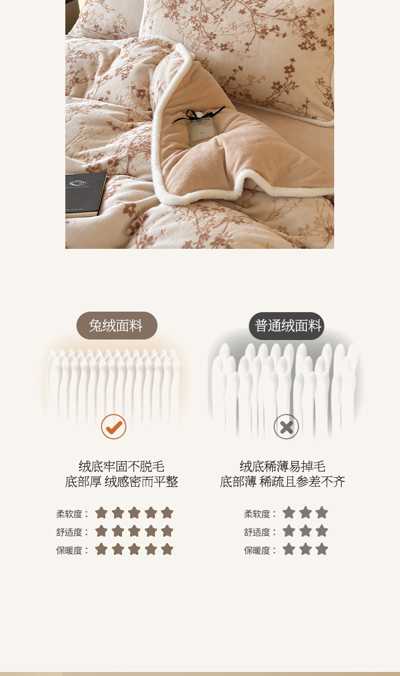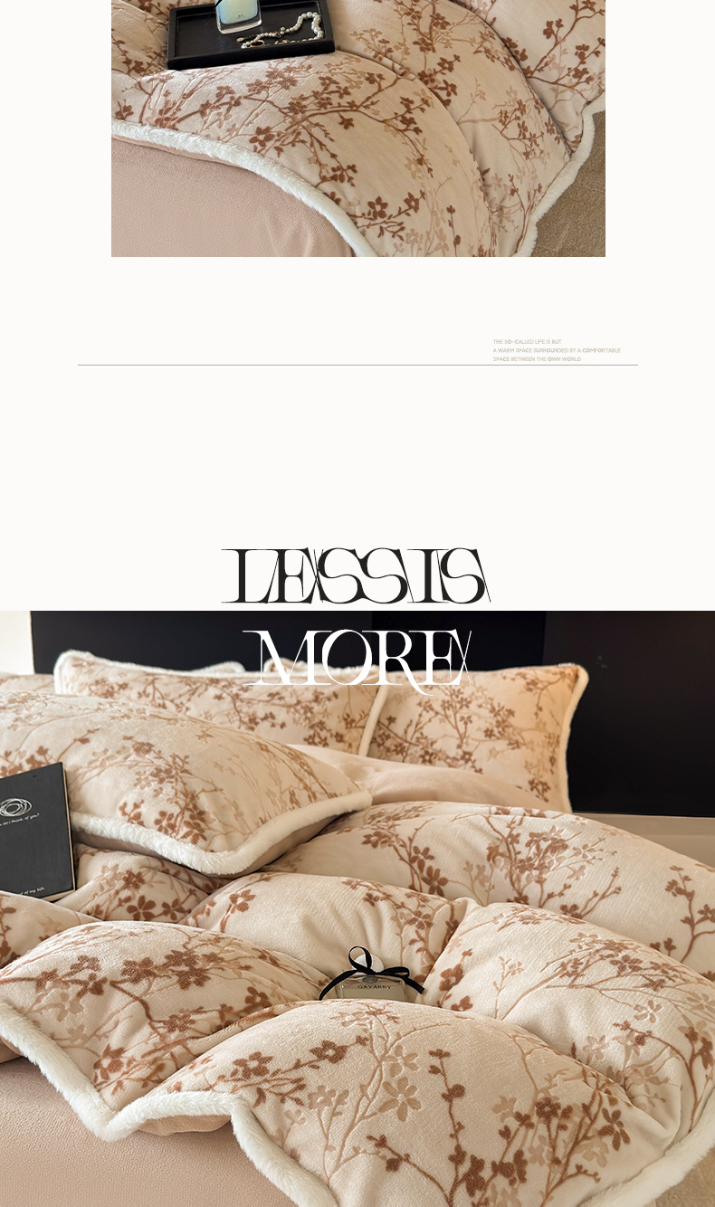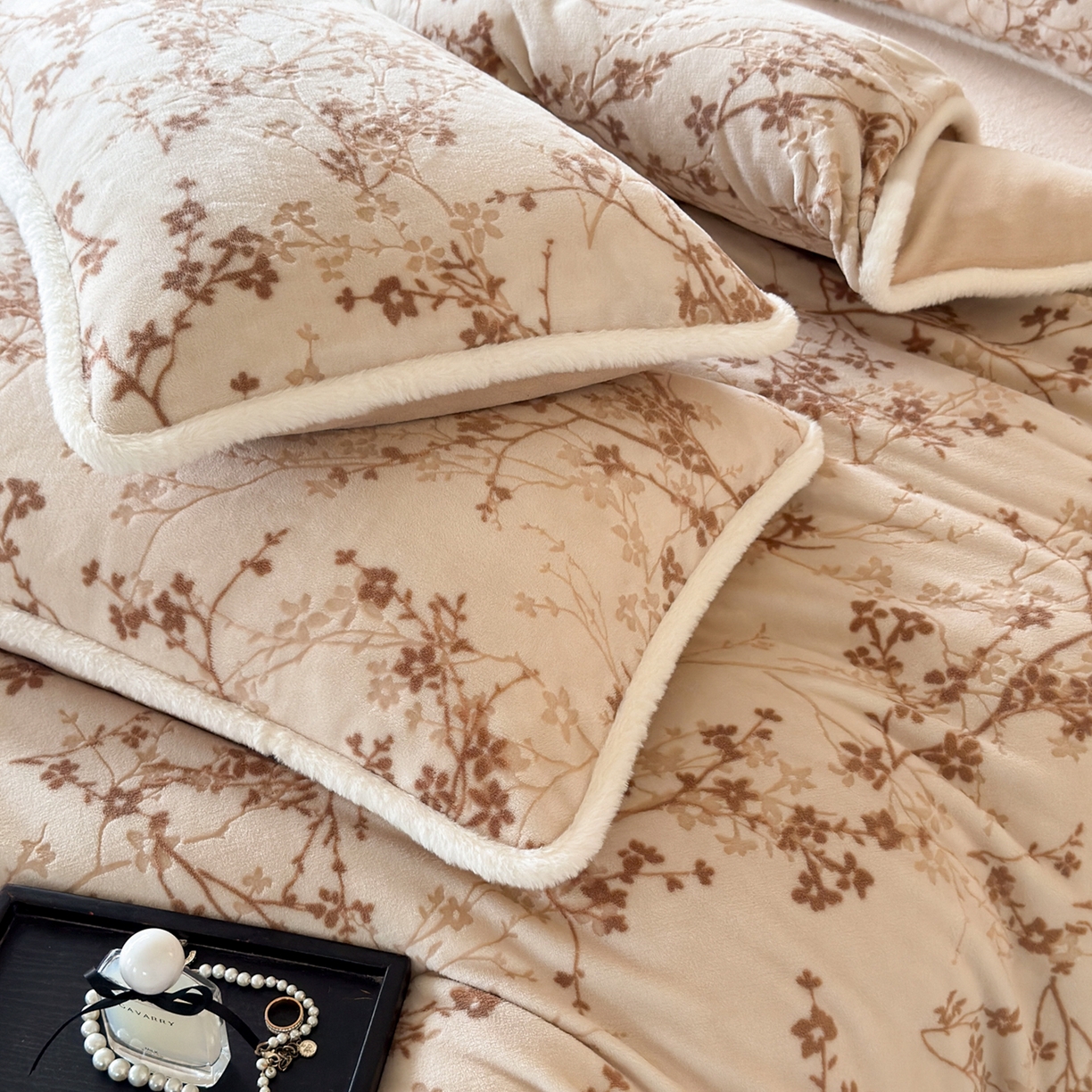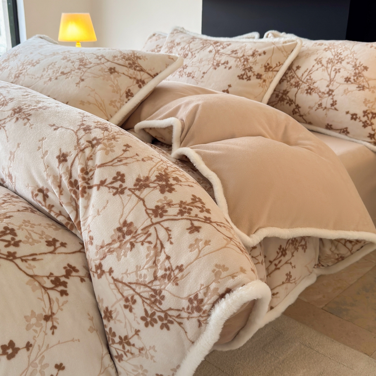 莱登卡奴 2025新款高克重牛奶绒雕花兔毛包边款系列四件套 山茶花语-咖