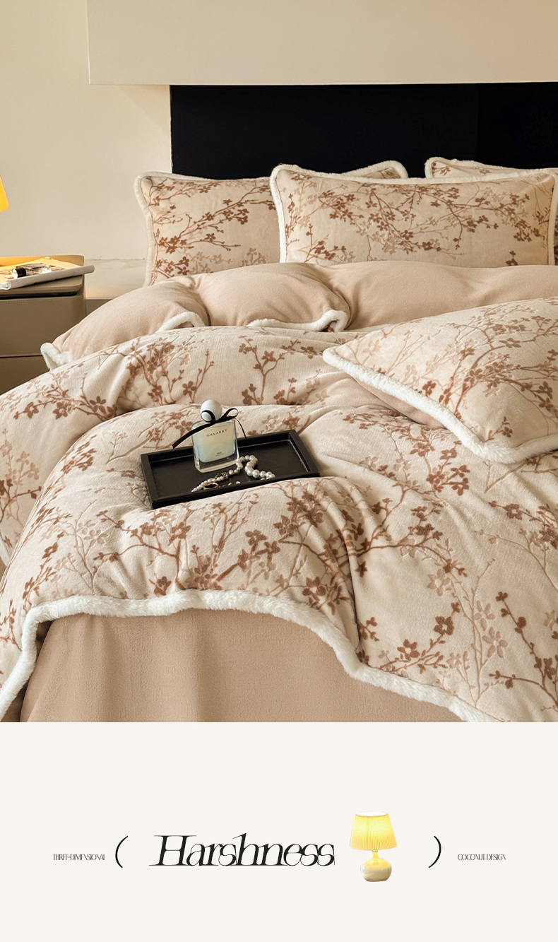 > 莱登卡奴 2025新款高克重牛奶绒雕花兔毛包边款系列四件套 山茶花语-咖