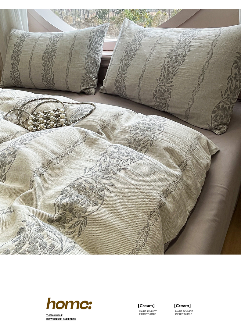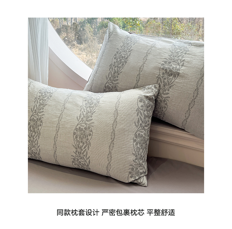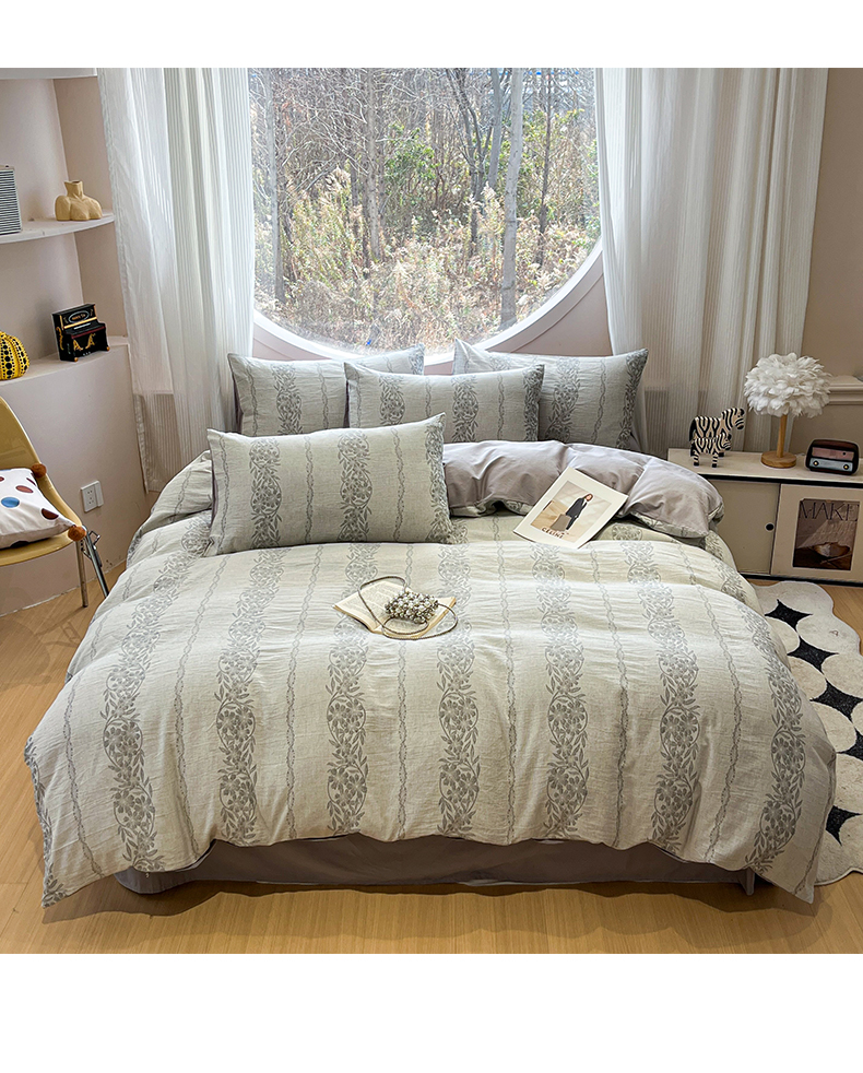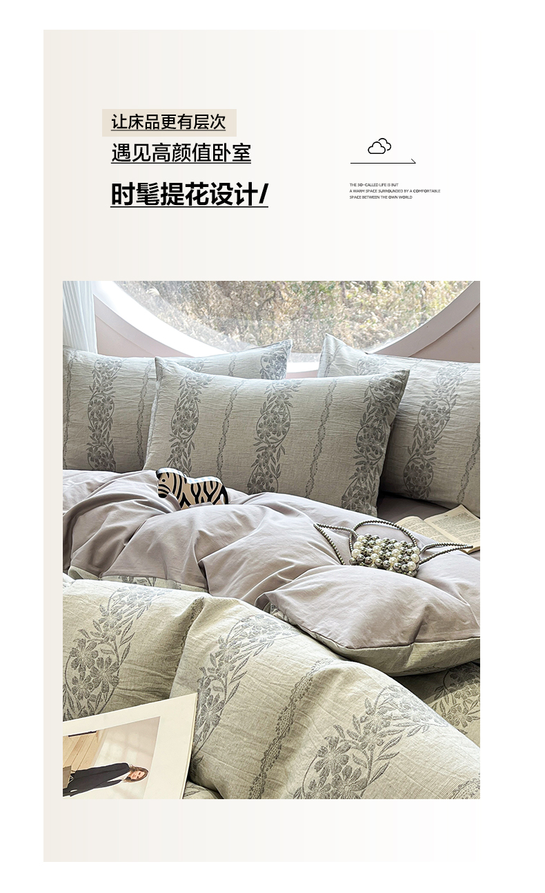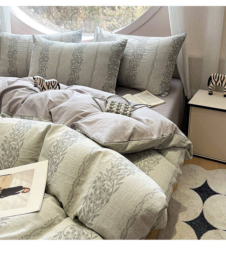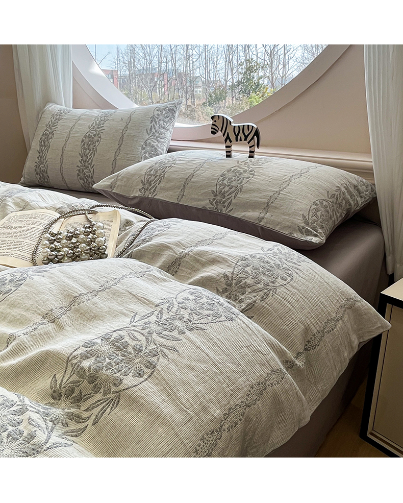 > 莱登卡奴 2026新款全棉A类三层纱水洗棉色织提花四件套系列 条蔓花语灰