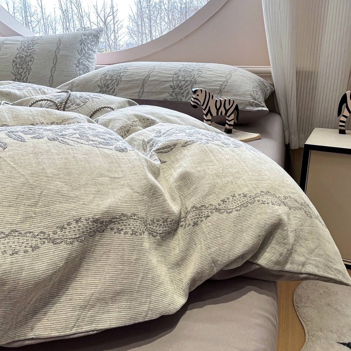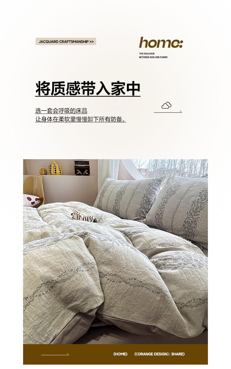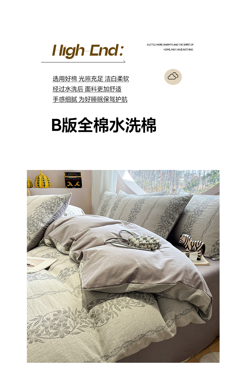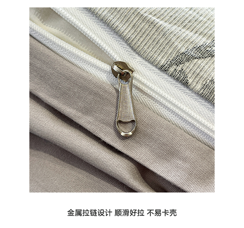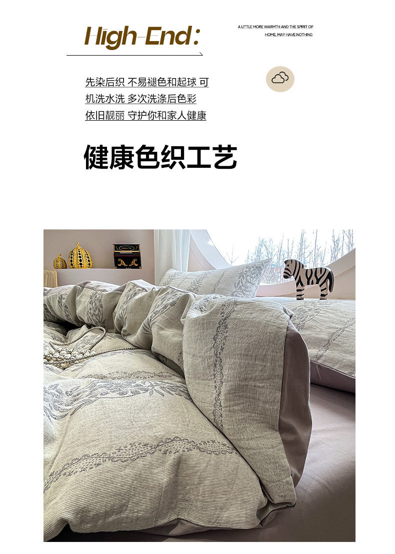 > 莱登卡奴 2026新款全棉A类三层纱水洗棉色织提花四件套系列 条蔓花语灰