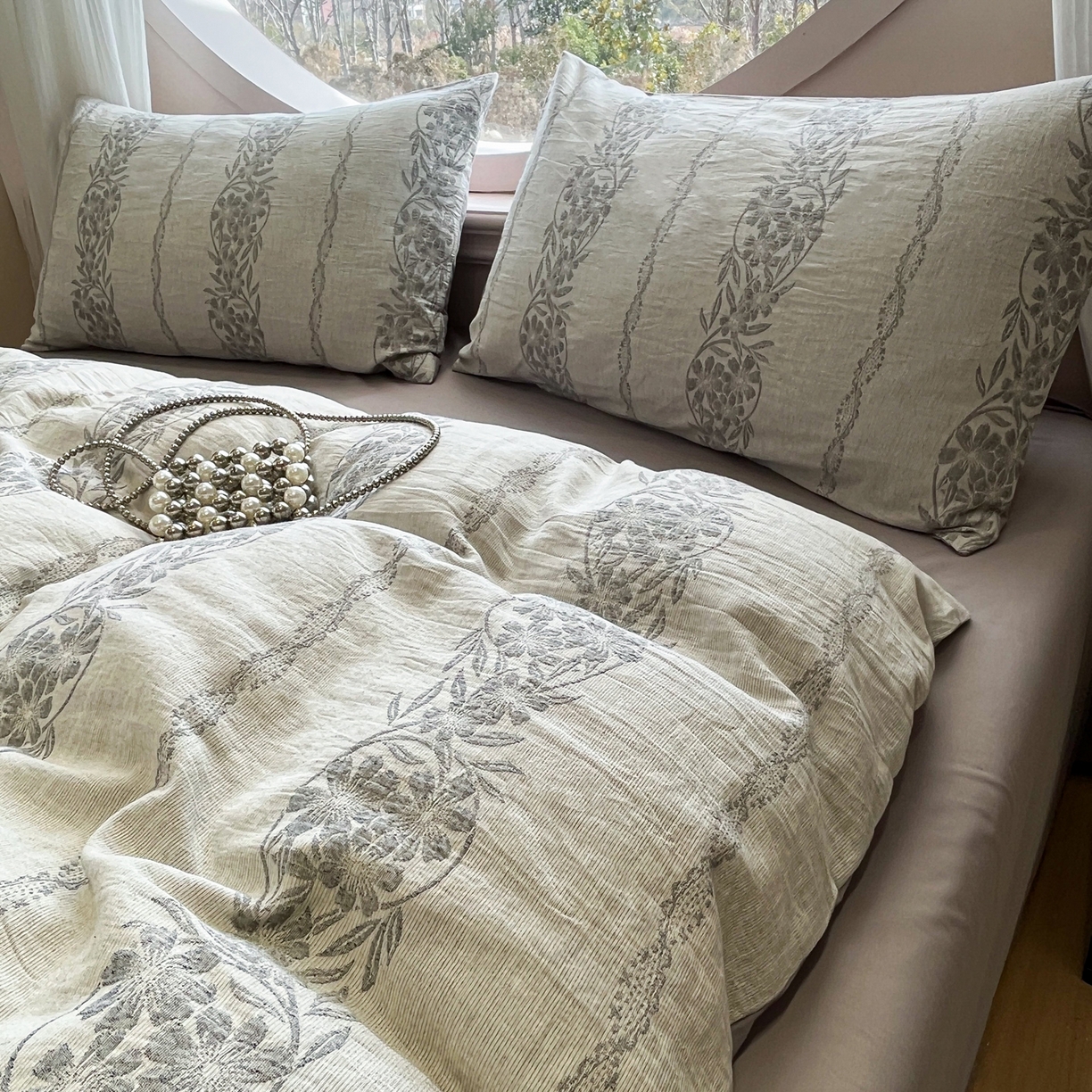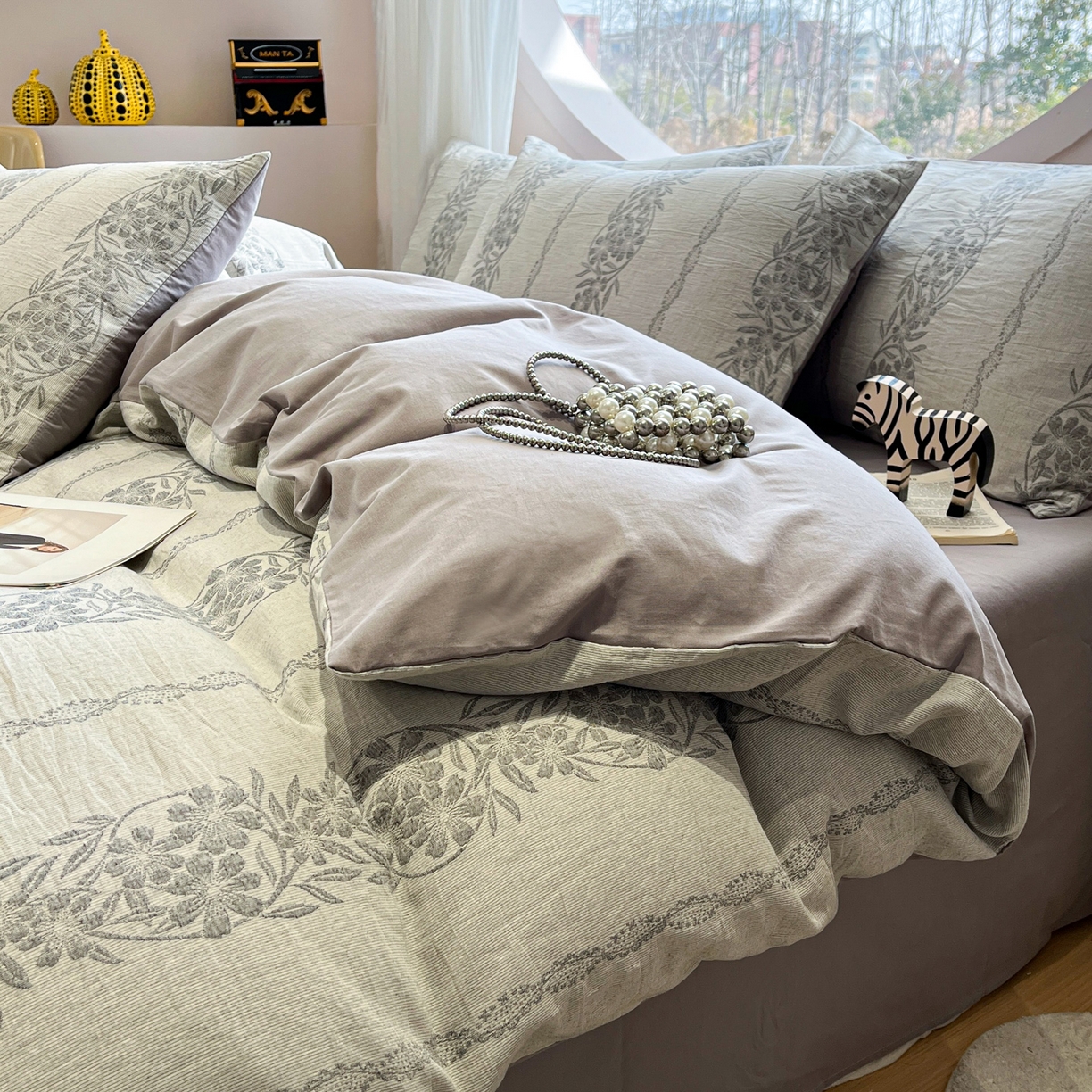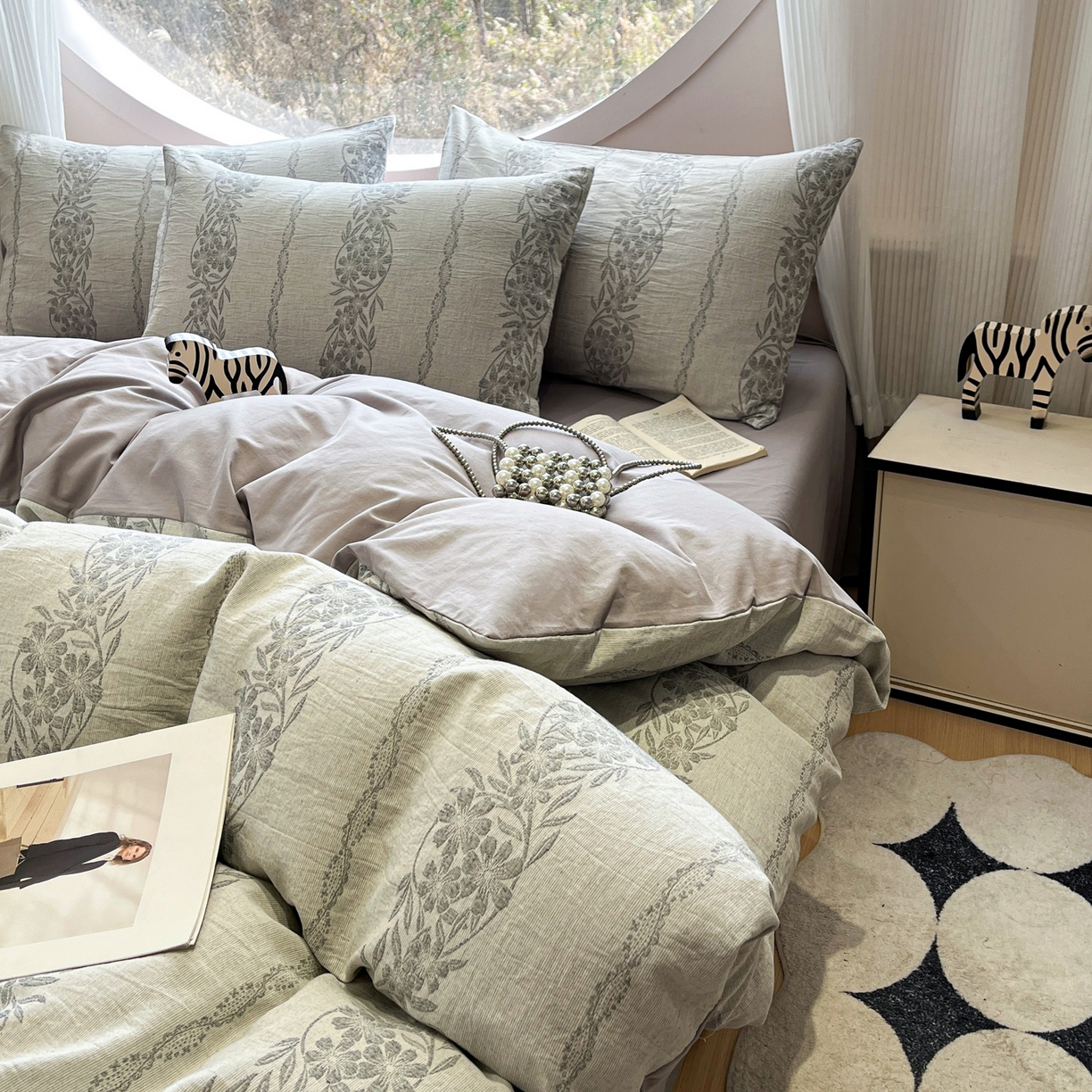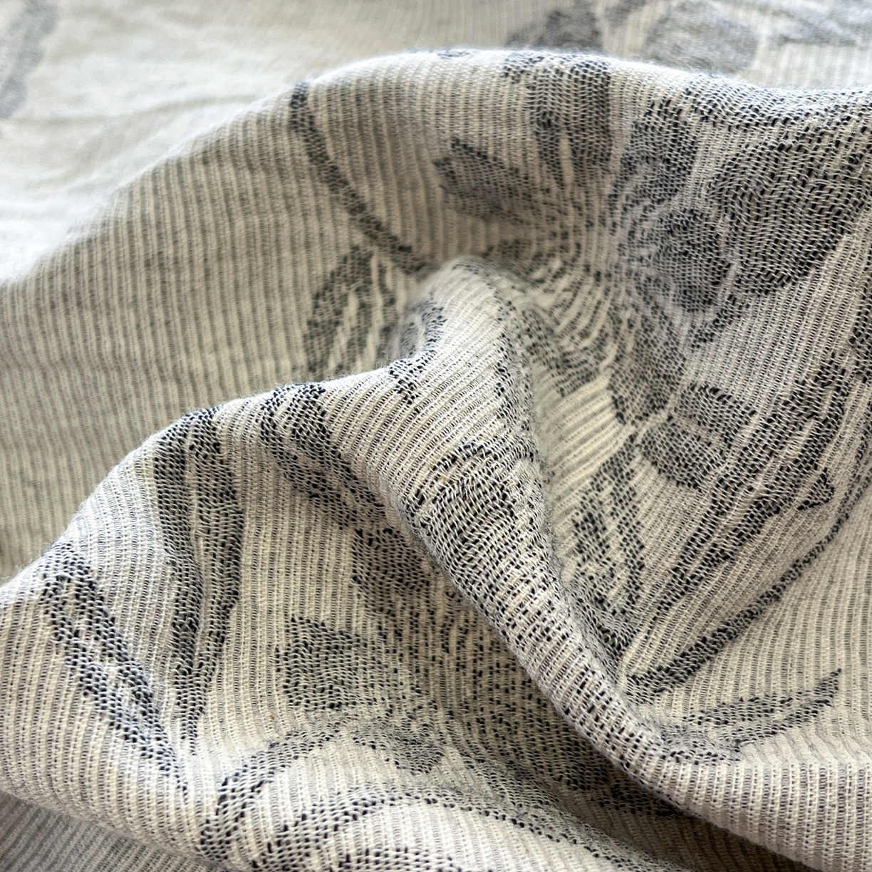 > 莱登卡奴 2026新款全棉A类三层纱水洗棉色织提花四件套系列 条蔓花语灰