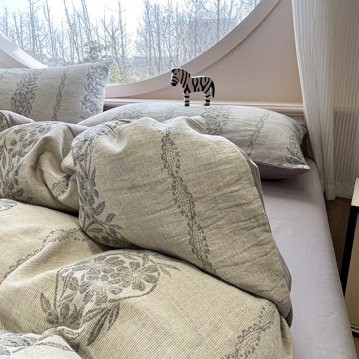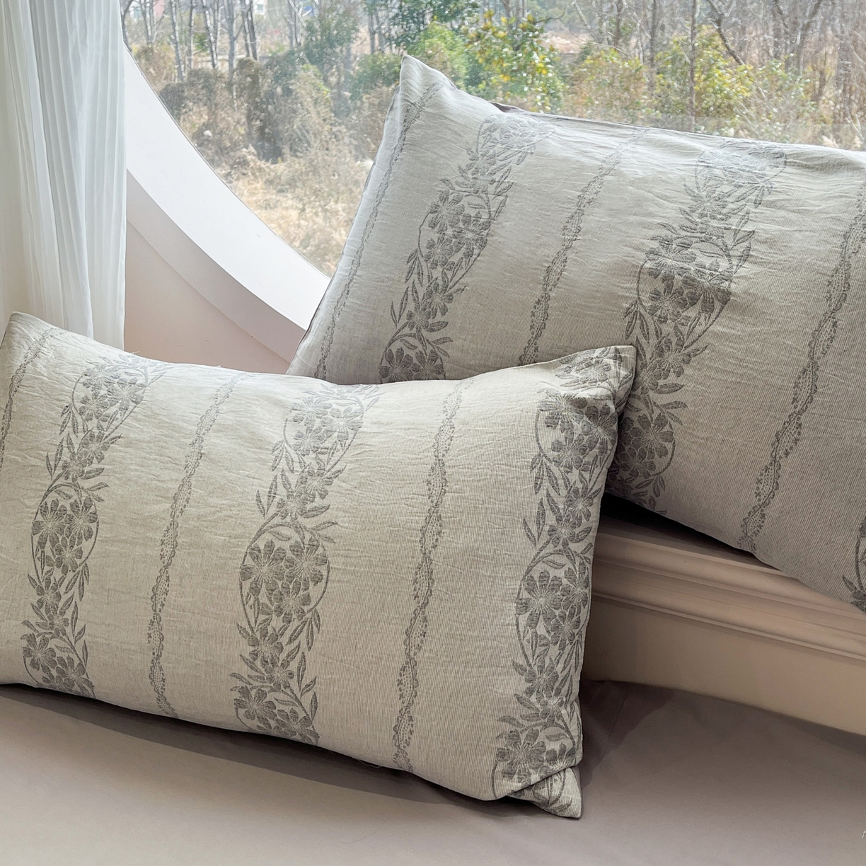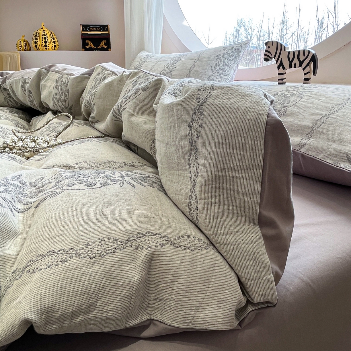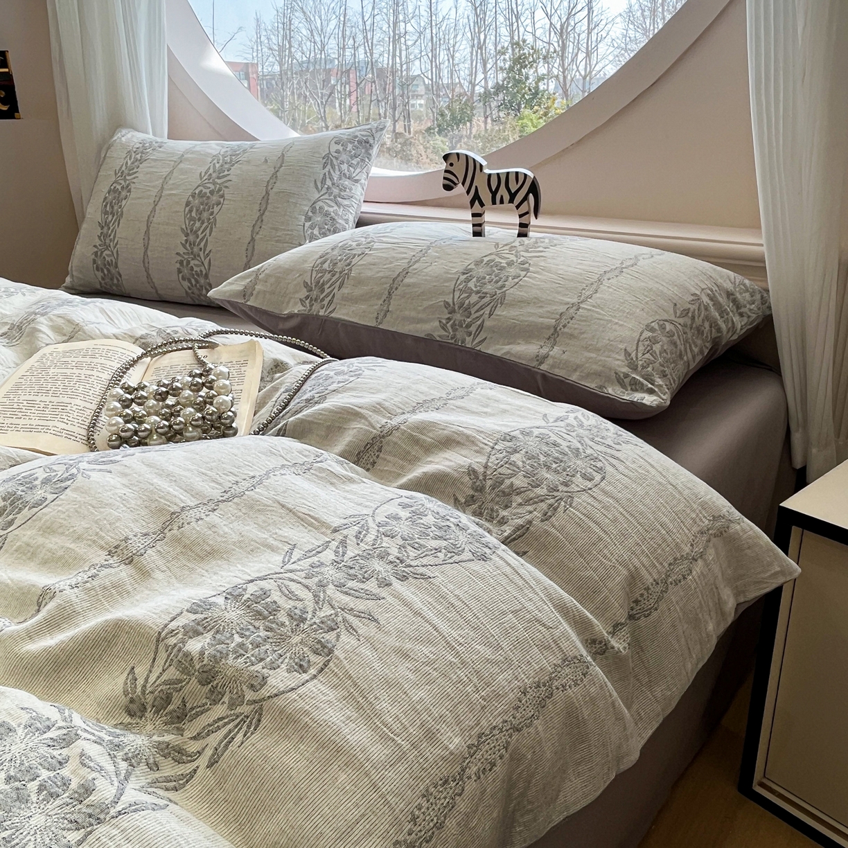 > 莱登卡奴 2026新款全棉A类三层纱水洗棉色织提花四件套系列 条蔓花语灰
