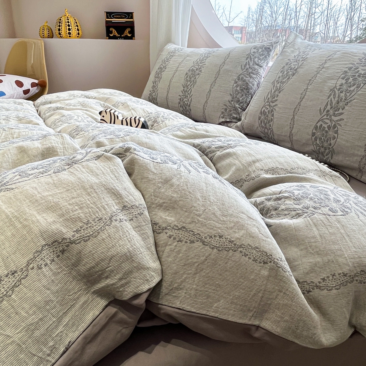 莱登卡奴 2026新款全棉A类三层纱水洗棉色织提花四件套系列 条蔓花语灰