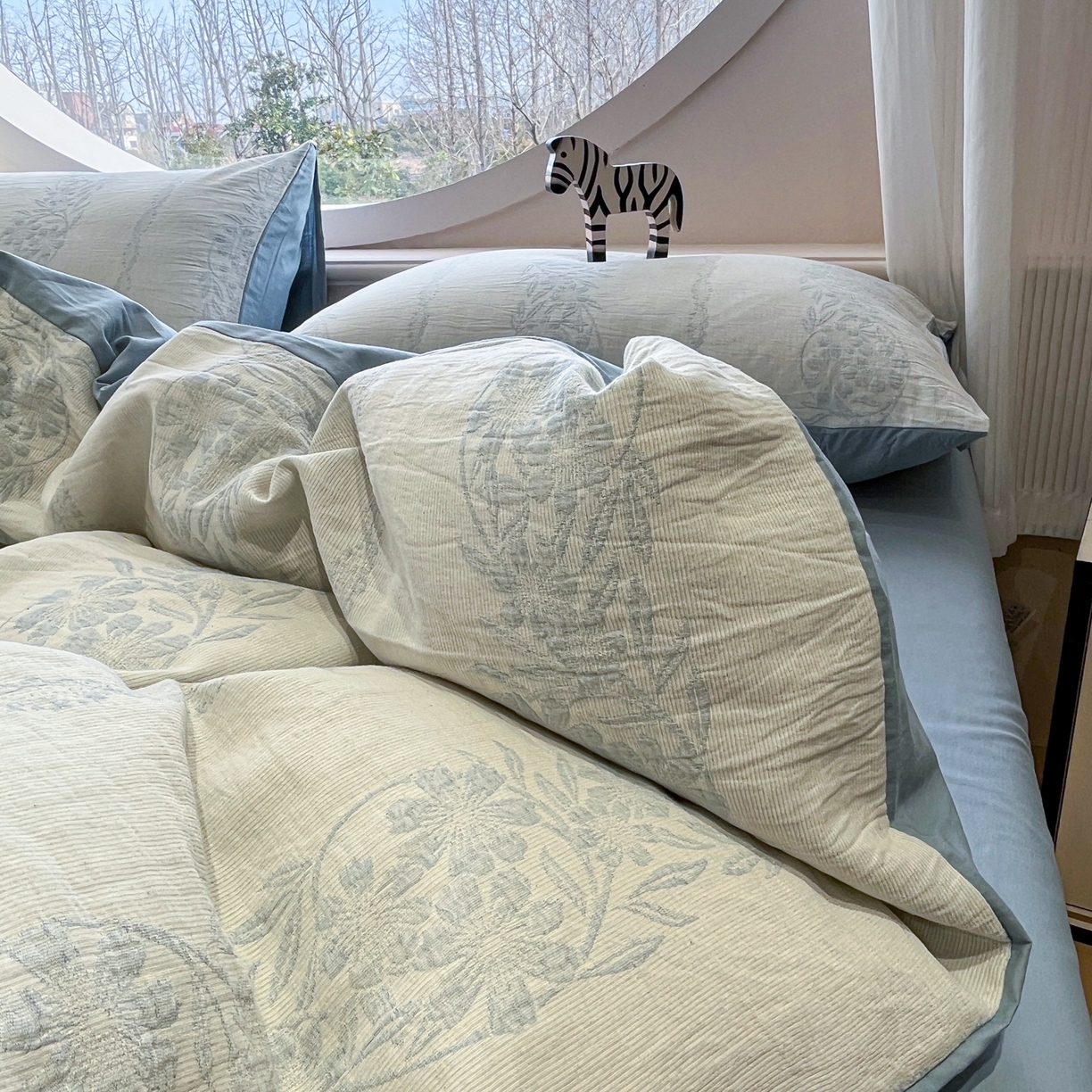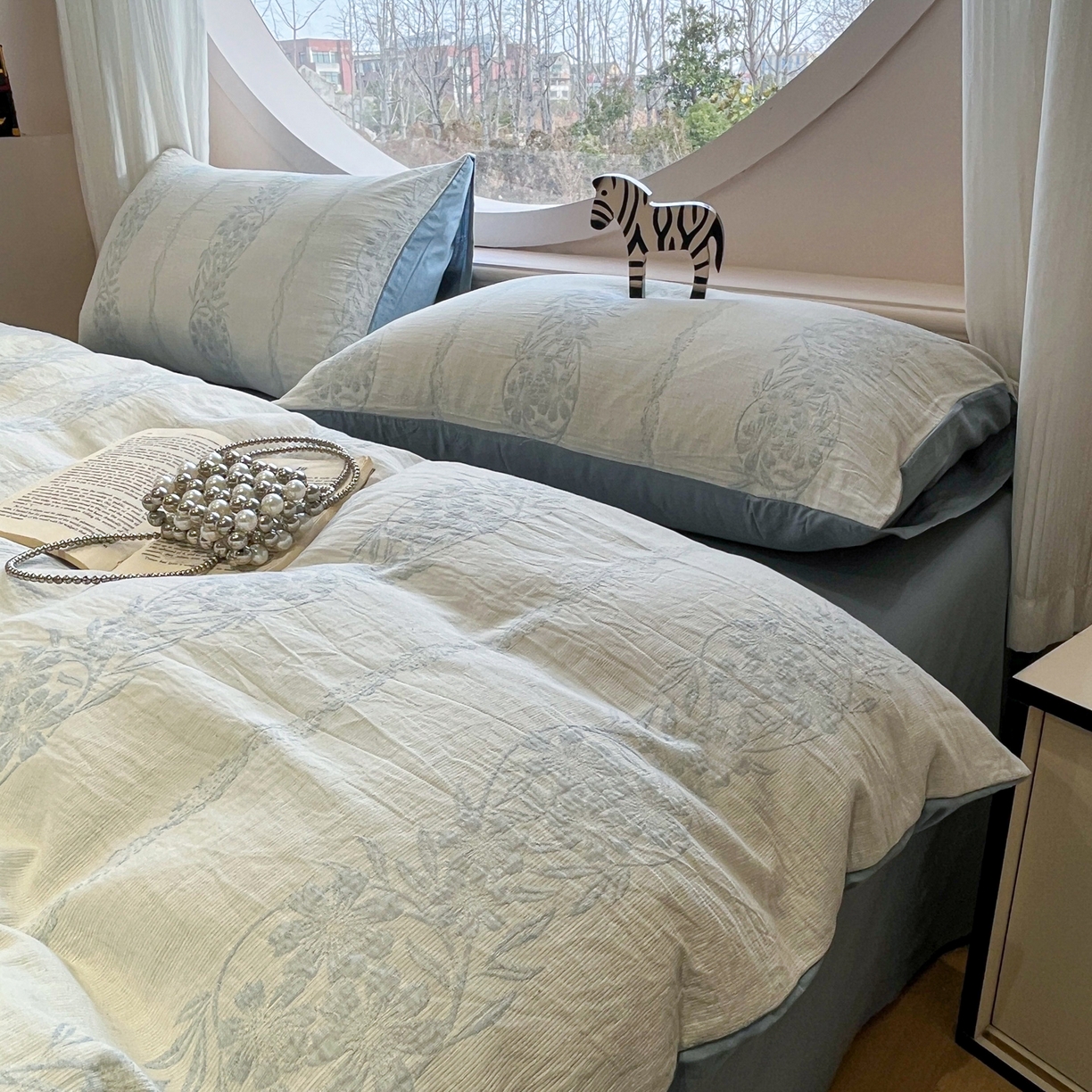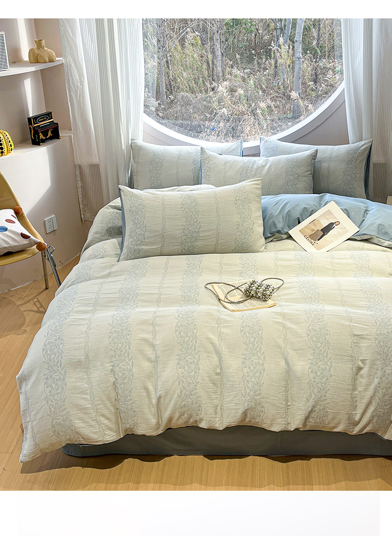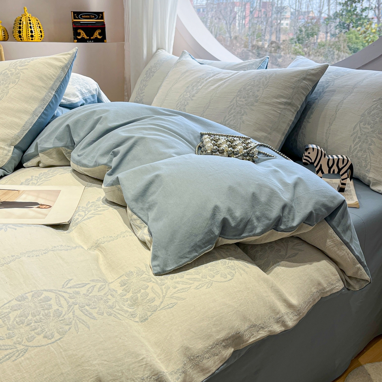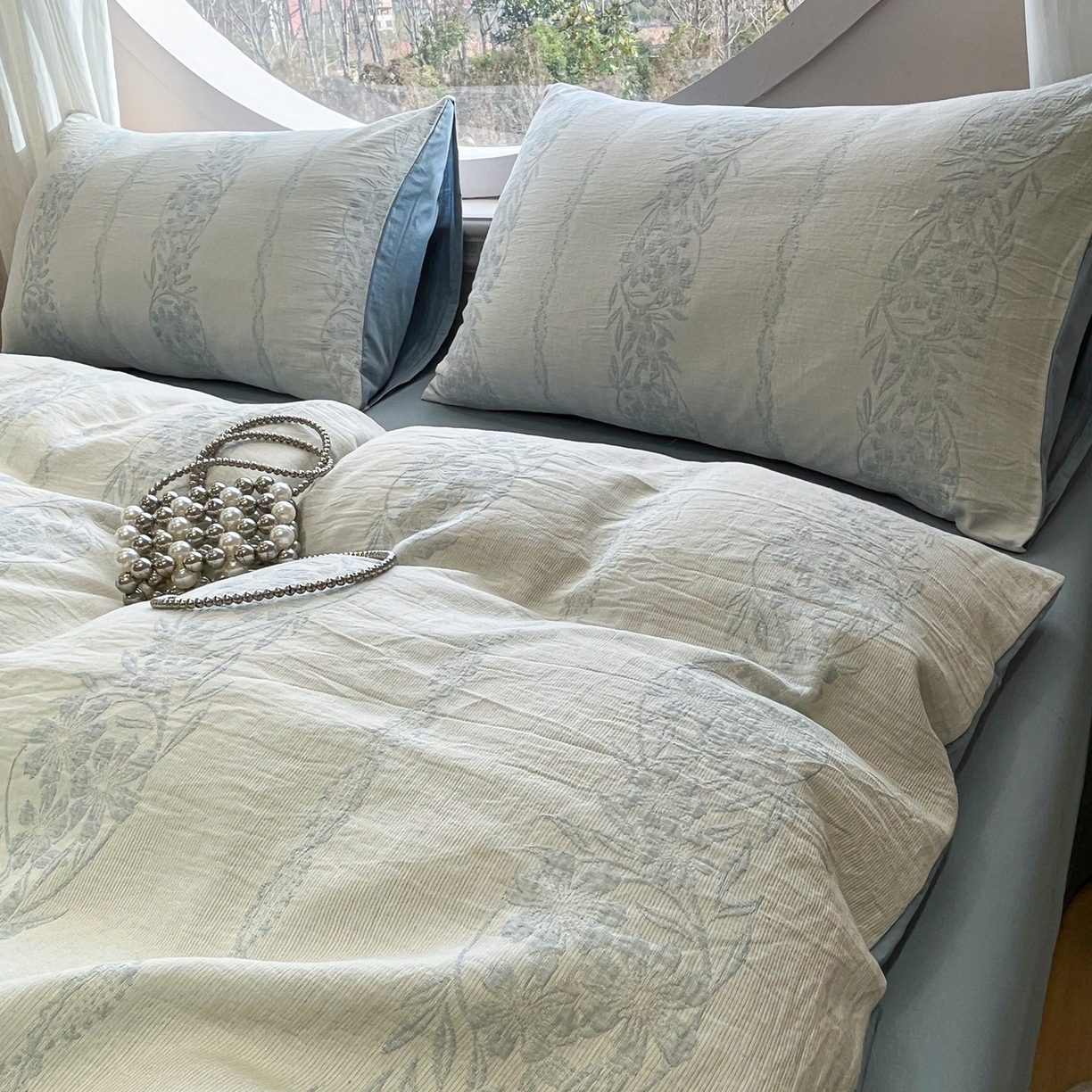 莱登卡奴 2026新款全棉A类三层纱水洗棉色织提花四件套系列 条蔓花语兰