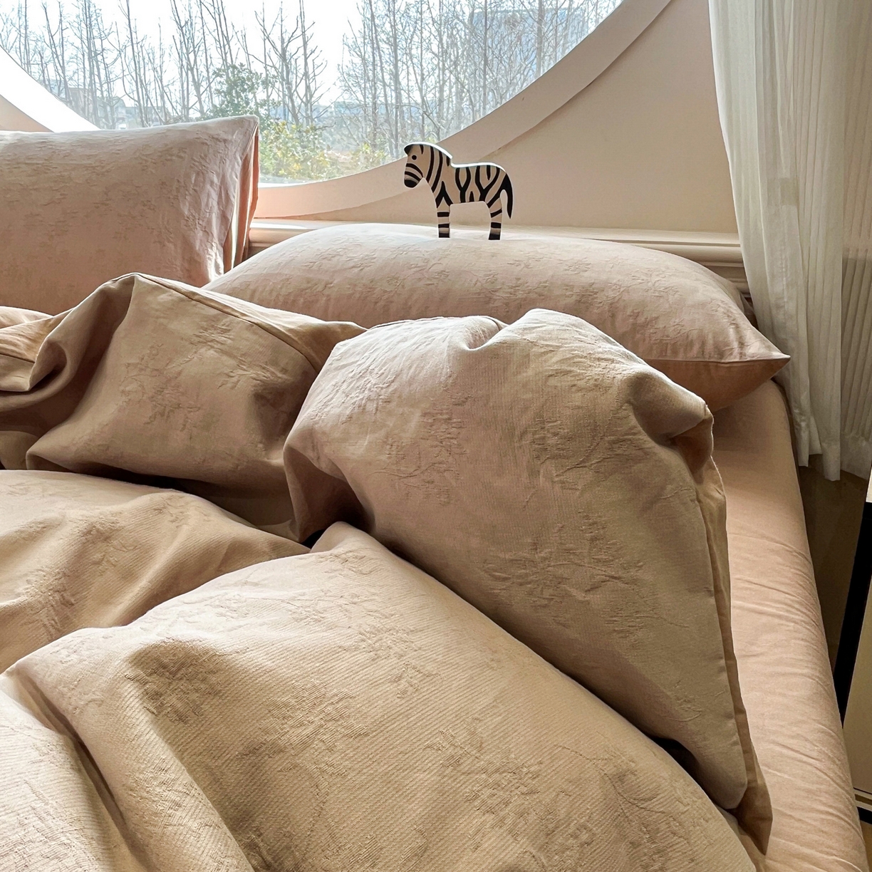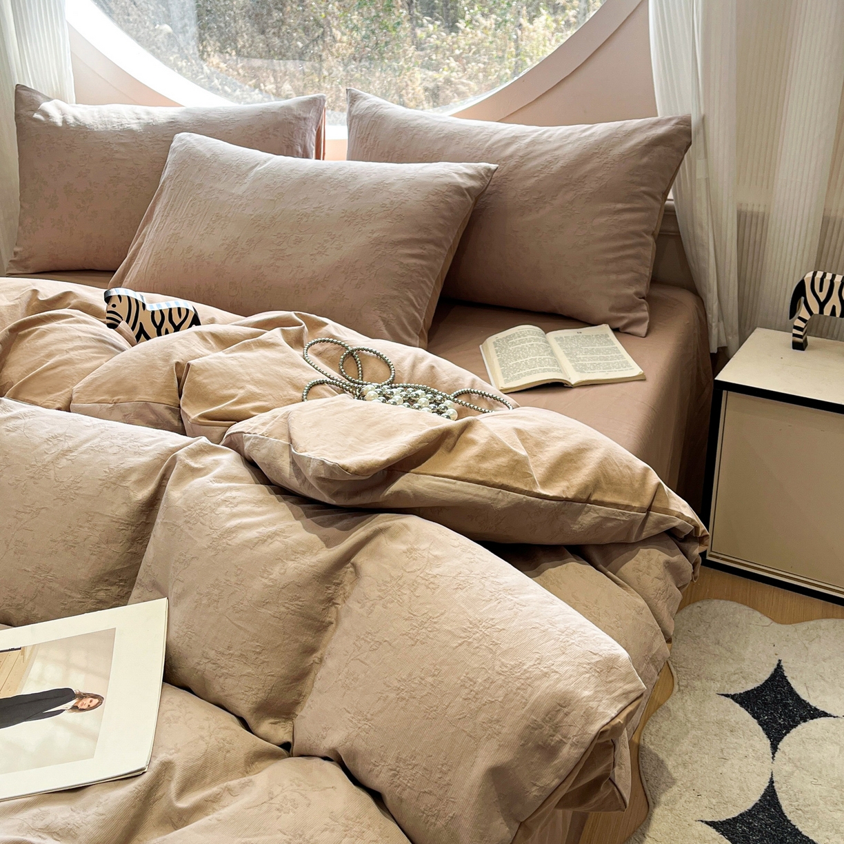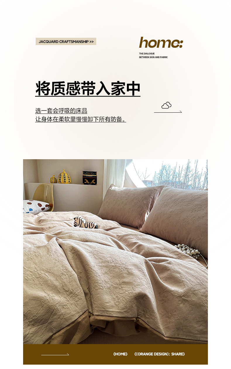 > 莱登卡奴 2026新款全棉A类三层纱水洗棉色织提花四件套系列 摇夜生姿浅咖