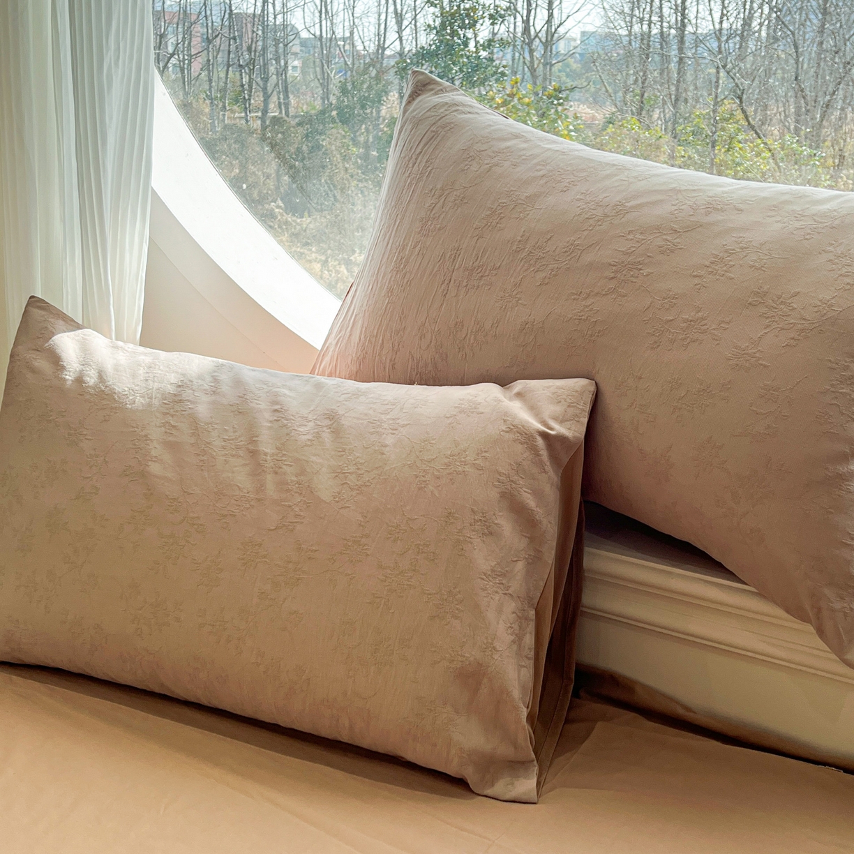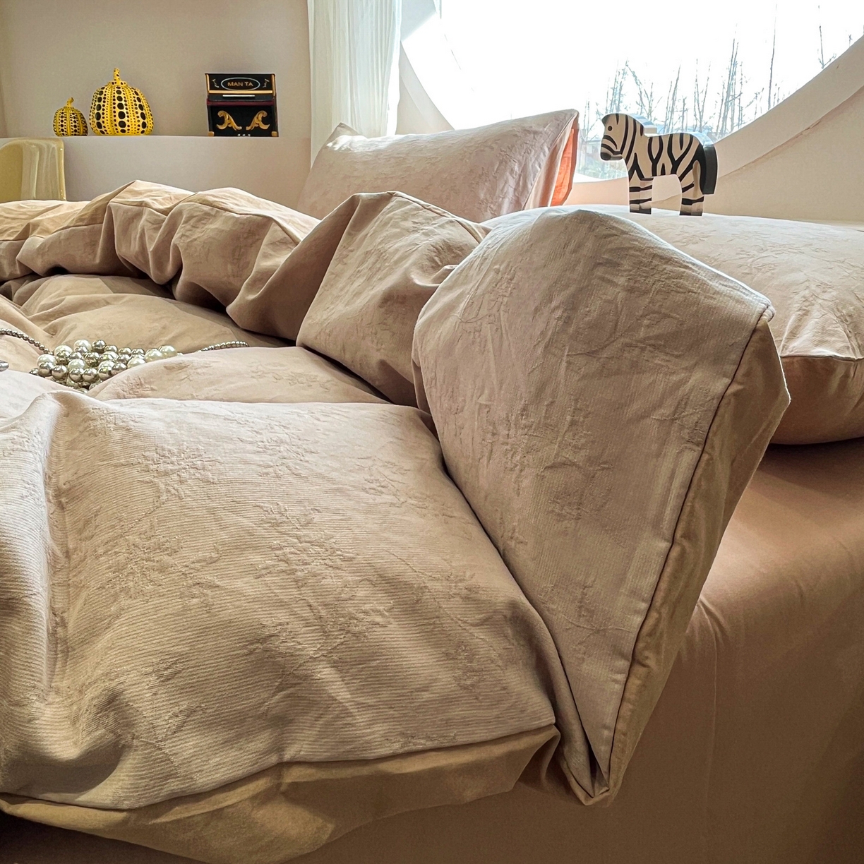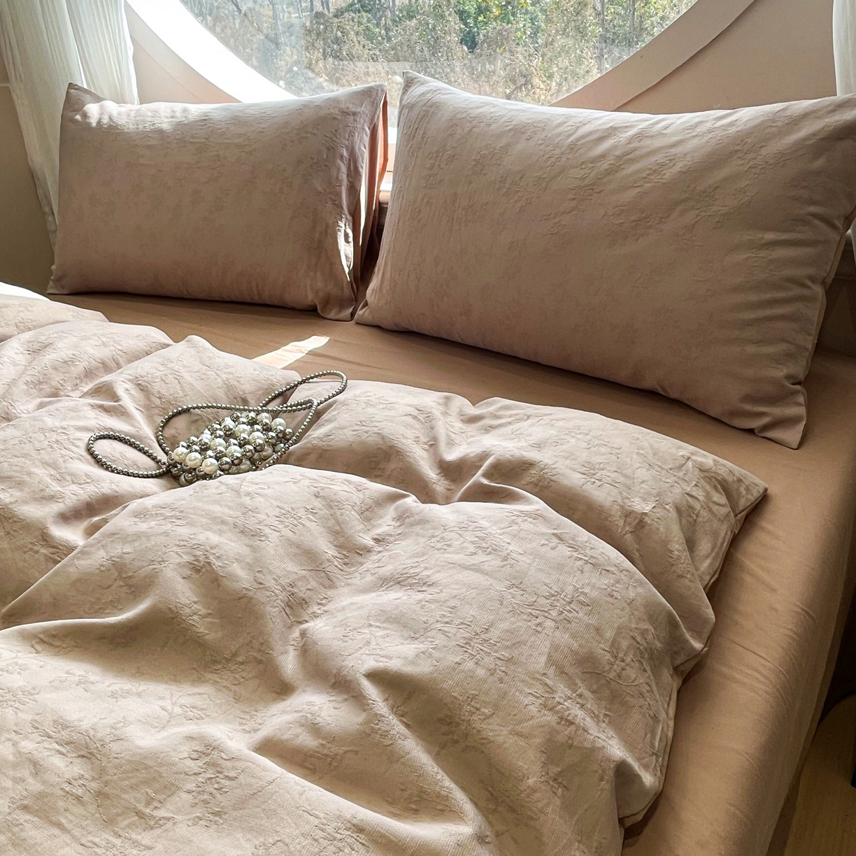 > 莱登卡奴 2026新款全棉A类三层纱水洗棉色织提花四件套系列 摇夜生姿浅咖